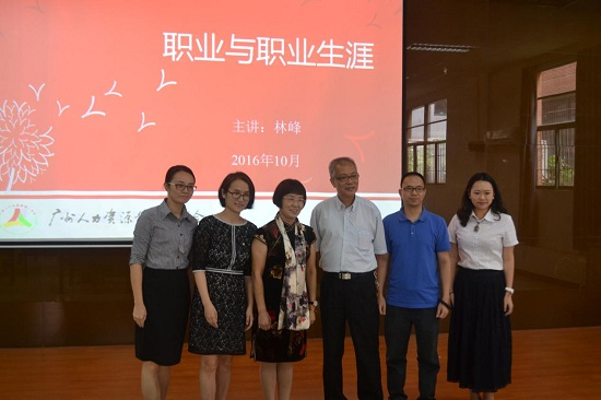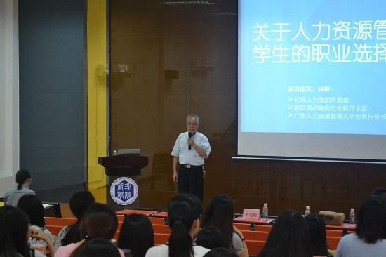 本网讯(记者袁梓怡)为让大四学生在步入职场前更好地了解不同职业和规划自己的职业生涯,10月26日上午,管理学院人力资源管理系于A9-101举办“职业与职业生涯”讲座,为毕业生指点迷津。本次讲座特邀红海人力集团前总裁、原红海战略委员会主席、广州人力资源管理人学会执行会长林峰担任主讲人,管理学院副院长暨双创学院常务副院长李旭穗、人力资源管理系教师林玮玮等出席本次讲座。