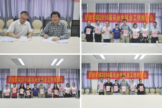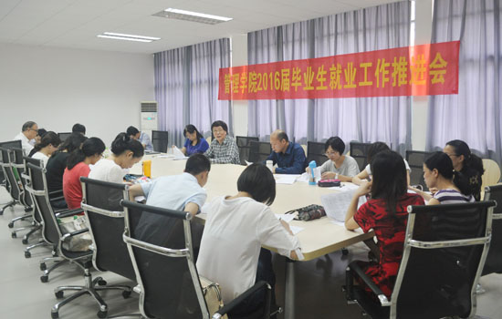 本网讯(记者周智伟) 为切实做好2016届毕业生就业工作,5月5日下午,管理学院在A8-302召开就业工作推进会,通报学院本届毕业生就业现状,突出重点,部署下一阶段就业工作。管理学院院长黄培伦,党总支书记、副院长苏来英,各教研室主任、毕业生辅导员、班主任、就业专员参加了此次会议。