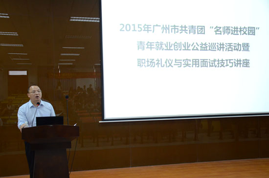 本网讯 6月11日下午,2015年广州市共青团“名师进校园”青年就业创业公益巡讲活动在A9-101举行。本场讲座以职场礼仪与实用面试技巧为主题,讲座嘉宾张淦锋老师,现任广州股权交易中心市场发展部总监。
