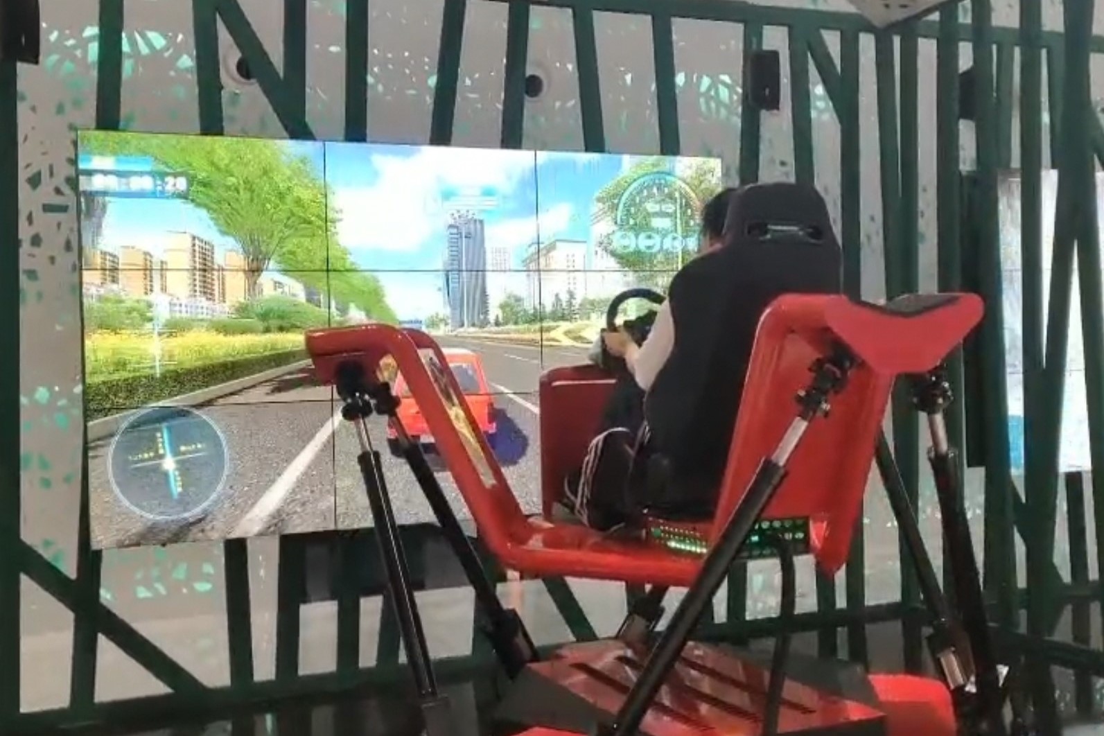 (图为团队成员在“生态∙创新——未来的故事”展区体验多媒体互动技术)