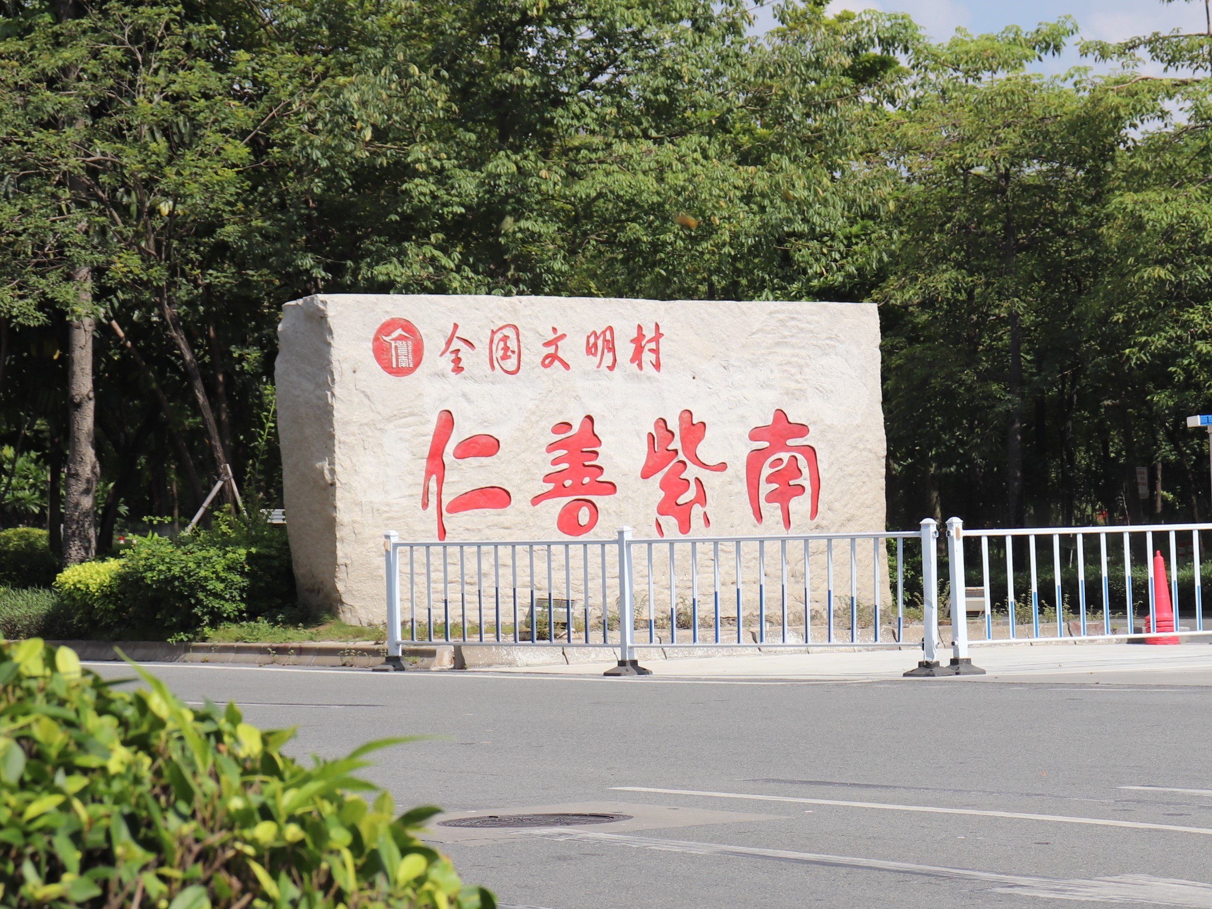 (图为佛山市禅城区紫南村“全国文明村——仁善紫南”石碑)