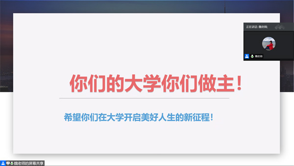 本网讯(记者李泳 陈风杭曾美兰)为了配合疫情防控工作,学校各级领导积极响应上级号召,秉承“少聚集”的疫情防控原则,管理学院心晴驿站于10月17日下午,在线上举办以“我的大学我做主——大学力量、精神、目标及规划”为主题的讲座。借此提高新生对大学的认知,明确大学的奋斗目标及方向,指引新生未来前进的道路。本次讲座的主讲老师为华南理工大学广州学院管理学院教授、工商管理系主任—魏卫教授。