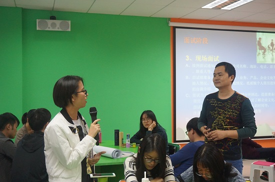 面试阶段,熊金红总裁认为最重要的是“重视”。对自己的重视、对企业的重视。熊金红总裁指出“个性化的简历设计在面试期间起着重要的作用,可以快速吸引面试官的眼球。”他表示一份好的简历不仅要有个性而且还要内容丰富,如个人资料尽可能详细,个人清晰的正面照,社会实践经历展示,醒目的自我评价等。并且他表示他特别重视孝道,在面试时会着重看面试者的家庭成员介绍。接着,他与同学互动,提问同学们面试的相关问题,并请同学上来做演示,这些都有效地活跃了现场气氛。