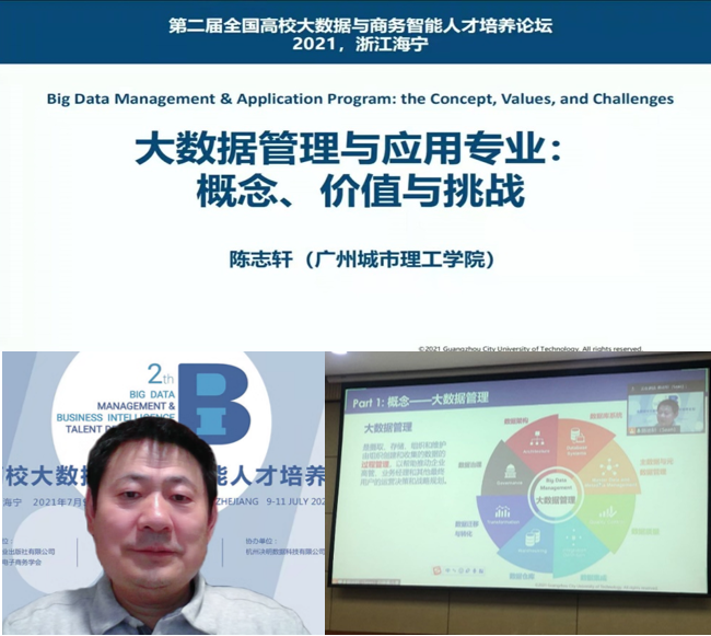 我校陈志轩主任在主会场做了题为《大数据管理与应用专业:内涵、价值和挑战》的主题报告。陈志轩的报告内容从多视角解析了大数据的含义、准确定位了大数据管理与应用专业人才培养的内涵、揭示了大数据管理类人才的培养价值以及在人才培养实践中的挑战与成果,得到了与会者的一致好评。我校作为全国较早成立大数据管理与应用专业的学校,其专业办学的规划和探索对于其他学校具有启示。