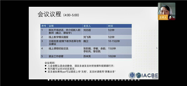 本网讯(记者陈奋展范梦迪)在全国人民共同战“疫”的特殊时期,为确保管理学院教育教学工作顺利进行,汇报分析毕业生就业工作情况,探讨疫情下的线上教学及明确下一步的工作部署,4月2日下午,管理学院召开全体教职工线上工作会议。管理学院暨创新创业教育学院院长刘志超,管理学院党总支书记、副院长苏来英,管理学院副院长刘飞燕及全体教师,参加了本次会议。本次会议由刘飞燕主持。