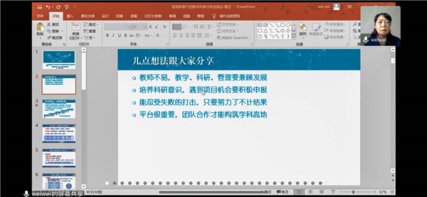紧接着,结合近期的线上课程,张彩娟、李彩凤、黎志凯等以自身的线上教学经验为例,分享“如何更好地进行线上教学”的心得体会。其中,张彩娟分享如何就线上签到、小组讨论和微信答疑三管齐下,确保教学效果。“虽然教学的地方和方式改变了,但是我们教育的初心没有变,心中有责、课中有情”,张彩娟如是说到。黎志凯指出,在线上教学中,最为贴近学生的教学方式为直播课,并且提出不能让学生成为只会听话的“小白兔”,而应让学生主动参与线上教学过程,积极思考。