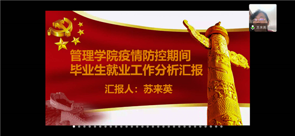 随后,苏来英就疫情下管院学子的就业情况进行汇报。她简要地介绍了管理学院毕业生的基本情况及就业情况。她指出“疫情使部分企业缩招或停招,是导致我院毕业生就业率降低的主要因素。”管理学院高度重视毕业生就业工作,为推动就业,我院召开毕业生就业商谈,启动应急响应服务机制,强化网络就业指导服务,推进省就业平台电子简历工作,组织毕业生参加线上招聘会,为我院毕业生就业保驾护航。