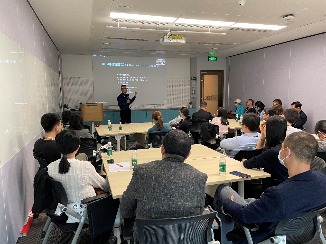 首先,在飞书南区渠道总监马健灏先生的带领下,我校管理学院一行先参观了企业的文化墙,了解字节跳动的发展历程及企业文化。