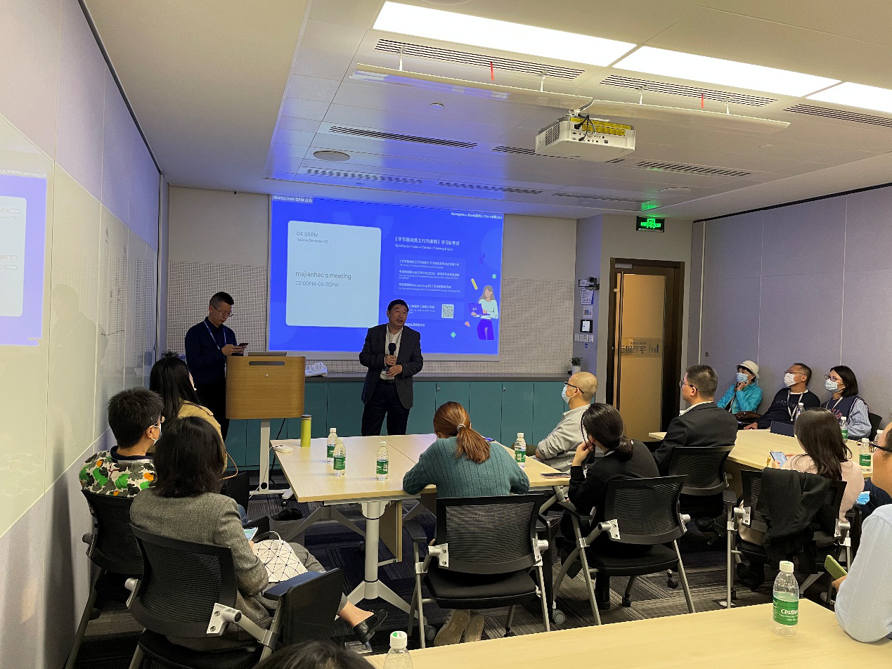 随后,双方在会议室进行了交流。马健灏先生详细介绍了公司的管理理念和企业文化,对字节跳动高速发展的模式作了阐述,并在现场对字节跳动公司旗下的办公平台——飞书进行了功能展示及技术运用,希望能够在教学过程中对老师们有所帮助,提高线上教学效率。在讨论与交流过程中,针对老师们提出的问题,马健灏先生一一做出了解答。