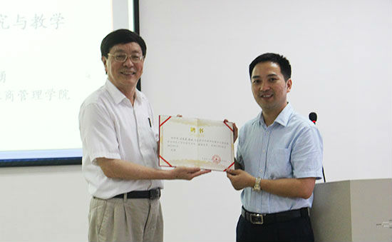 管理学院院长黄培伦向在座教师介绍主讲人万教授,对万教授在管理案例研究方面获得的成就表示肯定,希望教师们珍惜这次机会,汲取知识,加深对管理案例方面的理解,并宣布聘任万良勇教授为管理学院教师发展中心工作坊指导老师。