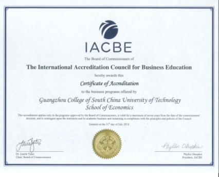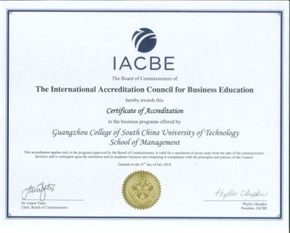 The School of Management, the School of Economics and the International Business School at Guangzhou City University of Technology has received specialized accreditation for its business programs through the International Accreditation Council for Business Education (IACBE) located at 11960 Quivira Road in Overland Park, Kansas, USA. GCUT is the first university in China with IACBE accredited programs.
