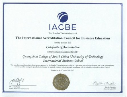 About GCUT's IACBE application process – The application for the IACBE accreditation mainly goes through three stages: educational member, candidacy and accredited member. GCUT has been educational member of the IACBE in November 2013 and is the first member institution of the IACBE in China. In 2016, GCUT completed the Outcomes Assessment Plan and candidacy site-visit. 4 business programs (International Economics & Trade, Business Management, Accounting, Marketing) have successfully been granted candidacy status in December 2016.