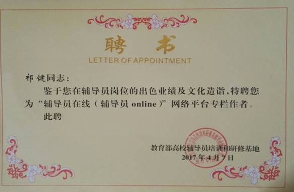 由于她在辅导员岗位的出色业绩和文化造诣,2017年3月受聘为“辅导员在线”网络平台专栏作者,并参与“广东省辅导员文化传媒栏目”项目。