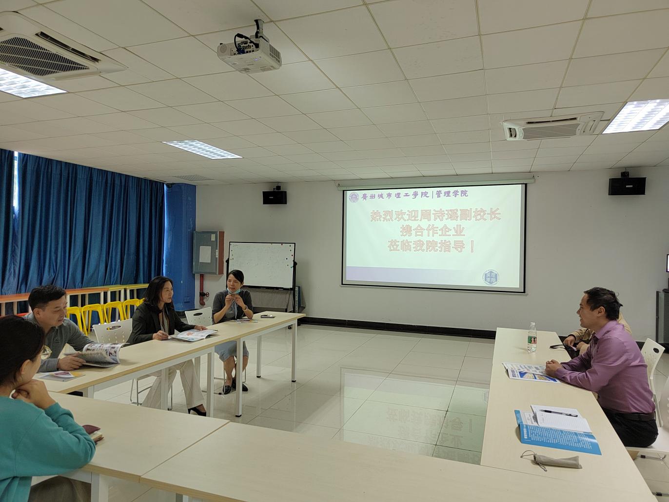 本网讯(记者 戴杰)2021年11月2日下午,广州城市理工学院副校长周诗瑶、管理学院党总支书记罗自力、副院长刘飞燕、学校党委宣传部副部长石靖雯等在A8-109热情接待广州市天河医和你信息科技有限公司总裁彭林教授、副总裁李倩女士一行。