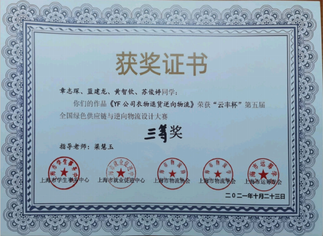 本网讯(记者 梁慧玉)10月23日, “云丰杯”第五届全国绿色供应链与逆向物流设计大赛决赛在上海第二工业大学拉开了帷幕。我院的参赛队伍“熬夜派队”队伍由20级电子商务专业2班黄智钦、苏俊婷,20级供应链管理蓝建龙,19级工商管理1班章志琛组成,在指导老师梁慧玉老师的带领下,历经重重选拔,在海选、初赛案例设计、决赛答辩多个环节,以出色的成绩斩获本次大赛三等奖。大赛汇集诸多名校,全国有多达319支队伍参赛,共1300多人参加,我院学生不负众望,最终作为进入决赛角逐的40组代表队之一,取得优异成绩。