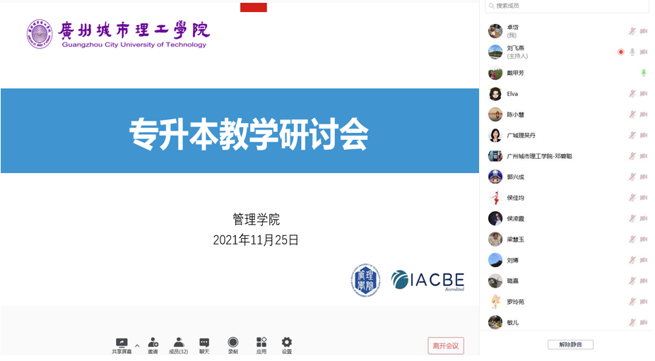 本网讯(记者 卓岱)为进一步做好管理学院专升本教学教研工作,11月25日晚上,管理学院召开专升本学生教学情况线上研讨会,会议由管理学院副院长刘飞燕主持,工商管理、电子商务、市场营销专业负责人及任教老师共32人参加会议。