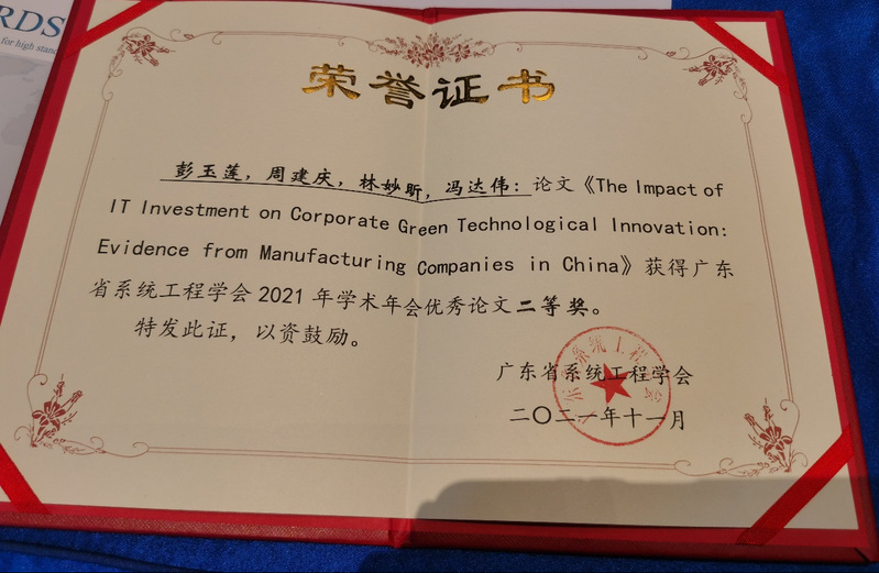 本网讯(记者 彭玉莲)广东省系统工程学会2021年学术年会于2021年11月26-27日在佛山召开,由佛山科学技术学院经济管理学院承办。本次学术年会以“双循环新发展格局下广东引领高质量发展的系统工程理论与实践”为主题向各界征文。本院彭玉莲老师的《The Impact of IT Investment on Corporate Green Technological Innovation: Evidence from Manufacturing Companies in China》通过专家几轮审核之后获得优秀论文二等奖。据悉获奖论文将推荐至《Journal of Information & Knowledge Management》(EI期刊)和《Journal of Systems and Information Technology》(EI期刊)发表。