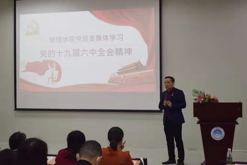 会上,罗自力书记带领与会党员代表共同学习学习党的十九届六中全会精神,重点传达了党的十九届六中全会概况,从整体、内容两方面对《中共中央关于党的百年奋斗重大成就和历史经验的决议》(以下简称《决议》)进行讲解,并通过对党的三次历史决议进行梳理、解读,更好地学习、认识这次历史决议的重大意义和丰富内涵。他说道:“《决议》科学阐明了习近平新时代中国特色社会主义思想的理论内涵和重大意义,表明了其在马克思主义发展史、在中华文化发展史上的重要地位。对习近平新时代中国特色社会主义思想的概括和阐述,是全会《决议》的一个突出亮点,也是一个重大贡献。”