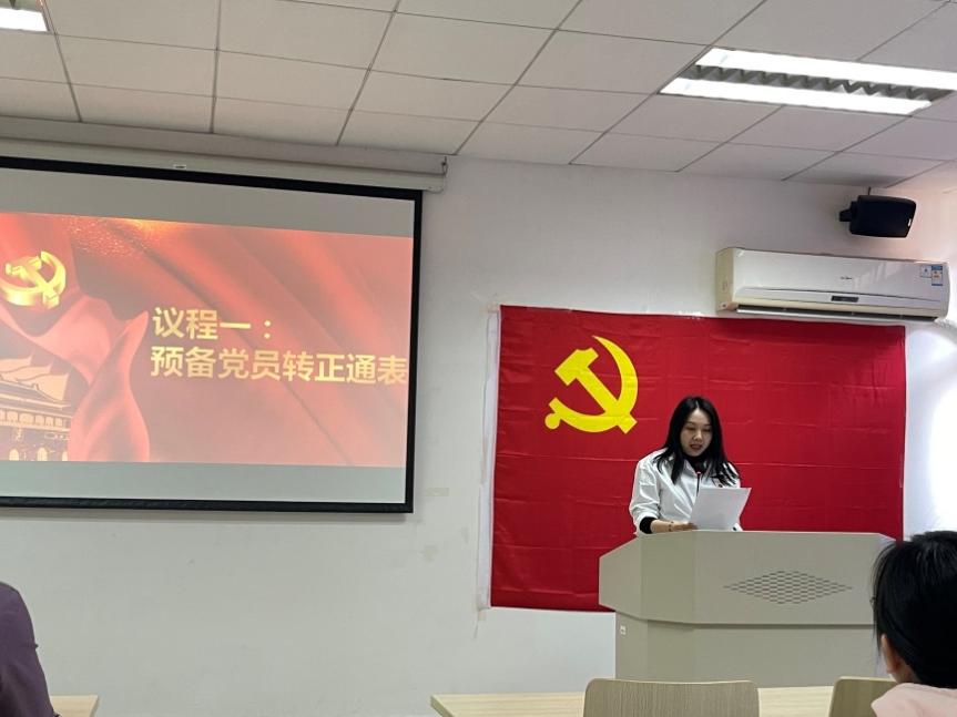 大会进行第一项,周姚同志宣读转正申请,汇报预备期间个人学习工作情况。随后,入党介绍人对其预备期考察情况进行汇报,并表明同意该同志按期转正。经无记名投票表决和讨论,最终同意周姚同志按期转为中共正式党员。