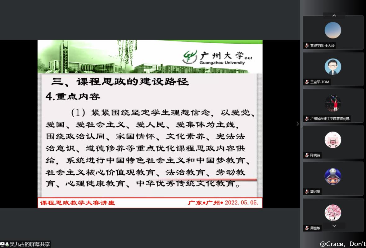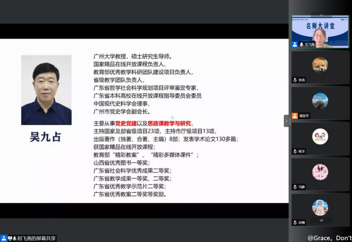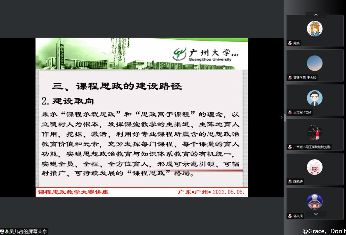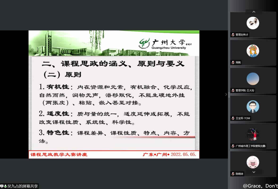 本网讯(记者 李选 梁齐 应澎)为了进一步加强高校课程思政的工作体系,全面贯彻丰富课程思政的应用,指导教师教学,5月5日下午,管理学院在腾讯会议上举办2022年“课程思政”讲座。本次讲座由广州大学教授吴九占主讲,本次讲座共吸引了120余名教师参加,此次讲座由学院副院长刘飞燕主持。