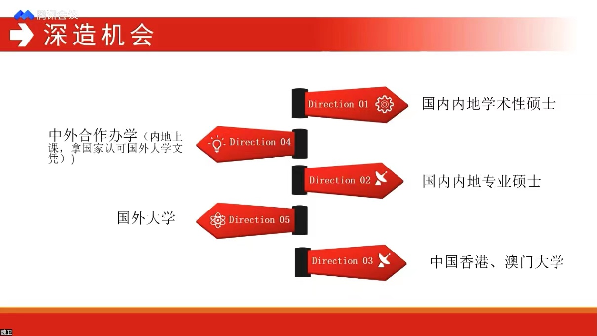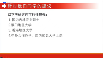 接着,魏卫对深造机会展开分析。围绕包括国内内地学术性硕士、国内内地专业硕士、中国香港、澳门大学在内的五个深造机会进行讲解。其中国内内地学术性硕士难度大,相比较而言,国内内地专业硕士的难度要小很多,专业对口,可以认真考虑。而如果要报考专业性硕士,全日制会更好一点。同时,她以华工工商管理学院为例,详细讲解了学术性硕士与专业硕士招录的区别。