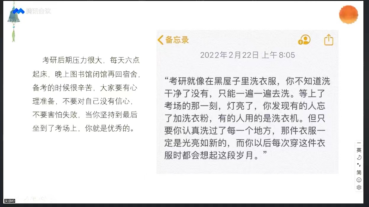 吴晓盼从择校、时间安排、备考经验三个方面展开。她在备考经验部分强调,方法因人而异,合适才最重要。此外,吴晓盼分享了一段考研期间激励她的话语。她表示备考时候很辛苦,大家要有心理准备。同时鼓励学生们不要对自己没有信心,不要害怕失败,当坚持到最后坐到了考场上,便是优秀的。