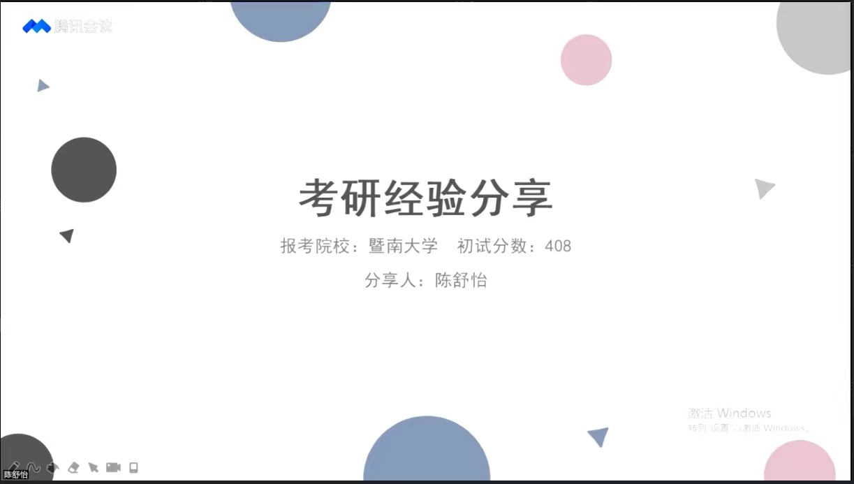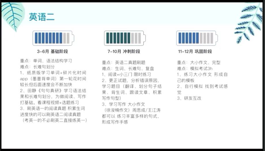 苏嘉琪着重从英语二、政治、专业课三个方面讲解了初试备考过程。她介绍了自己的备考时间、复习方法以及推荐了名师的课程。同时,她提出了包含多模拟面试、眼睛看摄像头、回答时要有逻辑性在内的多种复试面试小技巧。苏嘉琪引用电影《老男孩》中的一句台词“当你非常想做一件事的时候,你会向宇宙发出讯号,全世界的有缘人都会来帮助你。”来激励学生们能坚定不移的朝着自己的梦想努力。
