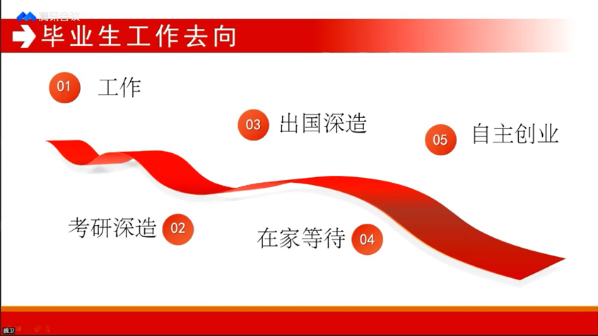首先,魏卫指出毕业生工作去向主要有工作、考研深造、出国深造、在家等待、自主创业五种主要选择。她表示,从过去来看选择工作的人数会更多,其他选择相对而言少一点。而本次讲座将着重讲为什么要选择深造。