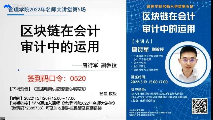 本网讯(记者 黄锶敏)为帮助广大学生深入了解区块链在会计审计中的运用,5月19日下午,管理学院在腾讯会议举办线上名师大讲堂,主题为“区块链在会计审计中的运用”,本次讲座特邀广州城市理工学院管理学院会计学专业教师、会计学博士唐衍军担任主讲人,近两百名学生参加了此次讲座。