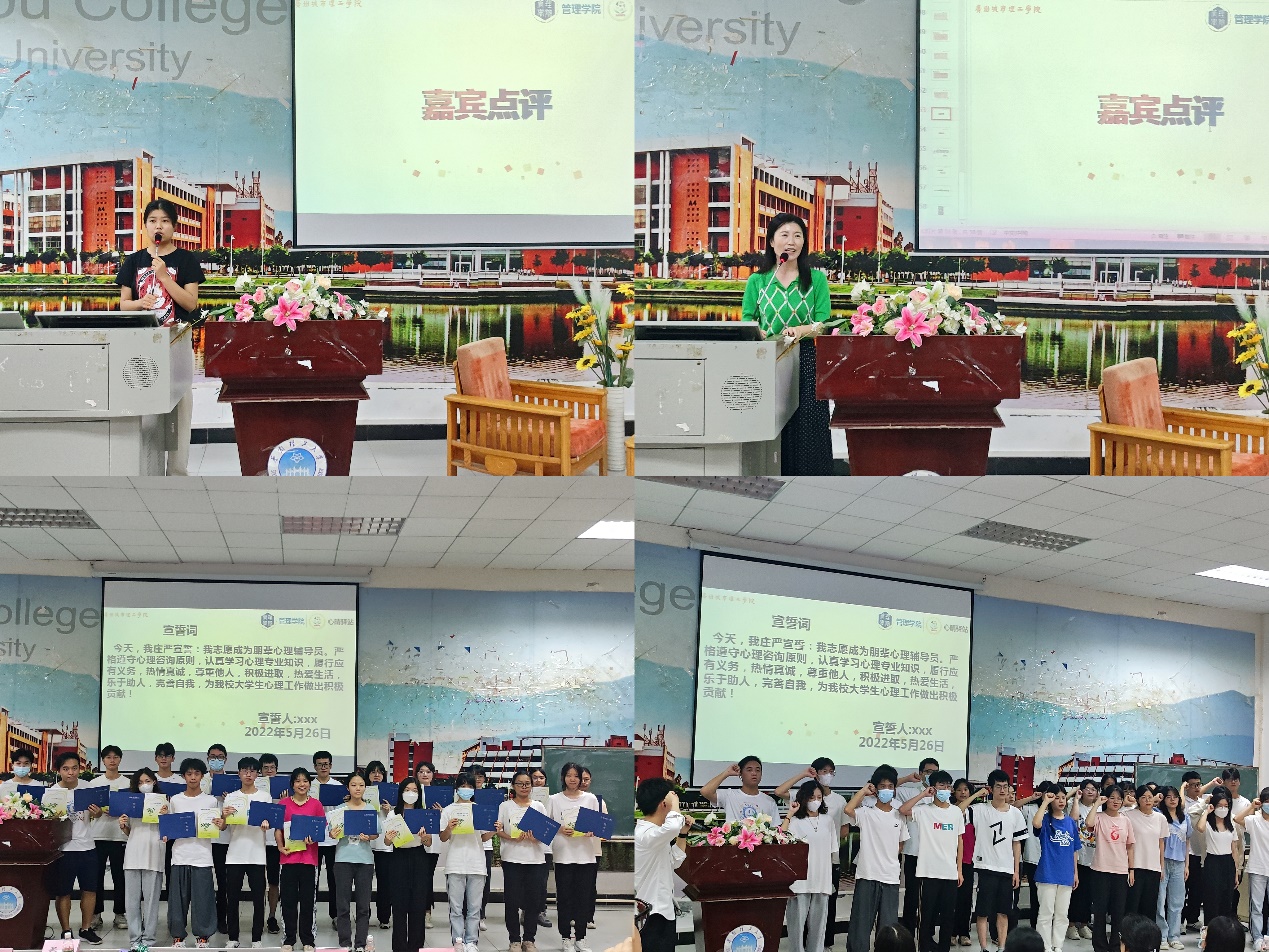 在总结讲话中,我校心理中心主任鲁丹凤老师说到:“朋辈辅导团队的建设和发展离不开历届朋辈辅导员的付出,是大家成就了现在欣欣向荣的朋辈辅导员队伍。她还对第八届的朋辈们寄予了厚望,希望新一届朋辈辅导员可以在《朋辈辅导员心理培训教材》指导下,助人并自助,为朋辈心理辅导员团队的专业化建设和为学校的心理健康教育工作贡献一份力量。”点评结束后,由孙丽老师为第八届全体朋辈辅导员颁发任命书。随着全体朋辈辅导员在领誓人的带领下庄严宣誓,本次“朋辈心理辅导技能大赛”圆满结束。