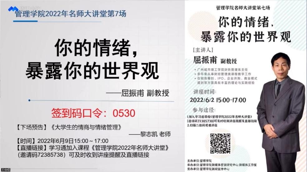 本网讯(记者 张泽鑫)为使学生更全面地了解人的三观,提高学生对自身情绪的控制能力,6月2日下午,管理学院在腾讯会议举办线上第七期名师大讲堂,本次讲座特邀广州城市理工学院管理学院财务管理系主任、副教授屈振甫担任主讲人,本次讲座有三百余名师生前来观看。