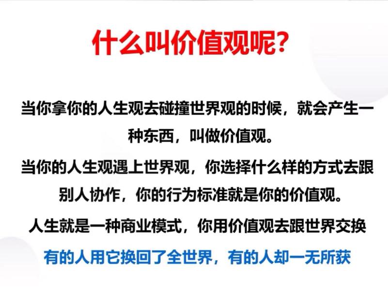 会上,屈振甫为同学们介绍人生观与价值观。他提到,人生观就是你怎么看待自己的人生,思考自己为什么活着,打算怎么活着,怎样活着值得,以及我是谁,要成为什么样的人,当你得出答案便是你的人生观。而当你拿自己的人生观去碰撞世界观时,自己会选择什么样的方式去跟别人协作,这个行为标准就叫价值观。世界观、价值观、人生观,三观都是围绕着“我怎么想的”来进行,是受自己生存的世界所影响的。