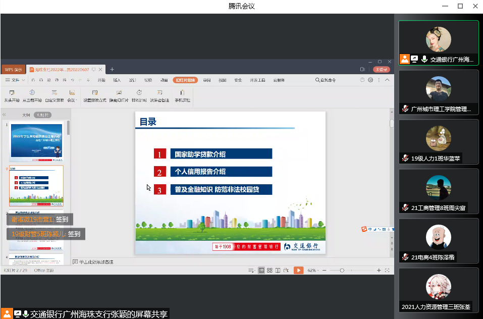 本网讯(记者 戴杰)为了进一步增强大学生诚信意识和防诈反诈意识,在学校党委宣传部、学生工作部、教务处的支持下,6月7日下午,管理学院以腾讯会议形式组织开展学生资助诚信教育与防范非法校园贷专题讲座。本次讲座邀请了交通银行广州海珠支行中级经济师张颖作为主讲人。