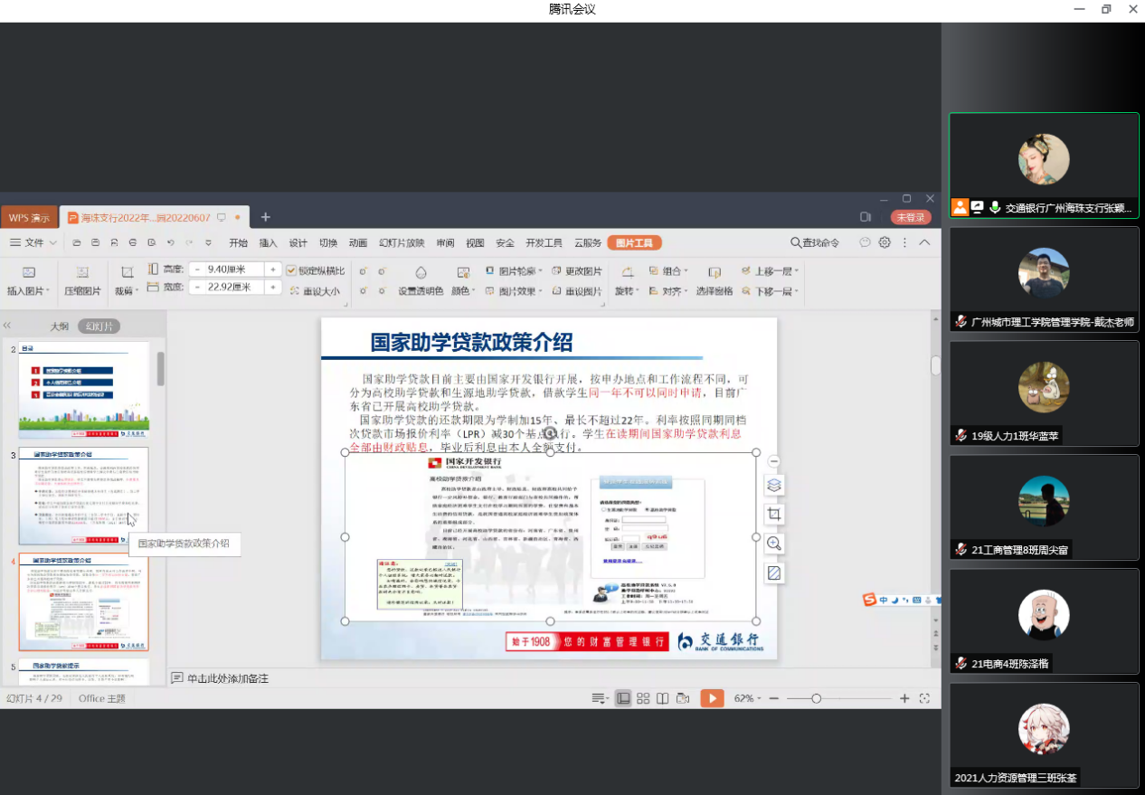 张颖主要围绕国家助学贷款、个人征信和防范非法校园贷三部分开展宣讲,在讲座中,她引入国开行国家助学贷款最新免息及延期还款公告信息,征信报告查询和国家反诈APP推广,穿插工作中遇到的实际案列进行分享,还通过现场互动投票,提升讲座活动的趣味性和参与度,受到参会同学的欢迎。