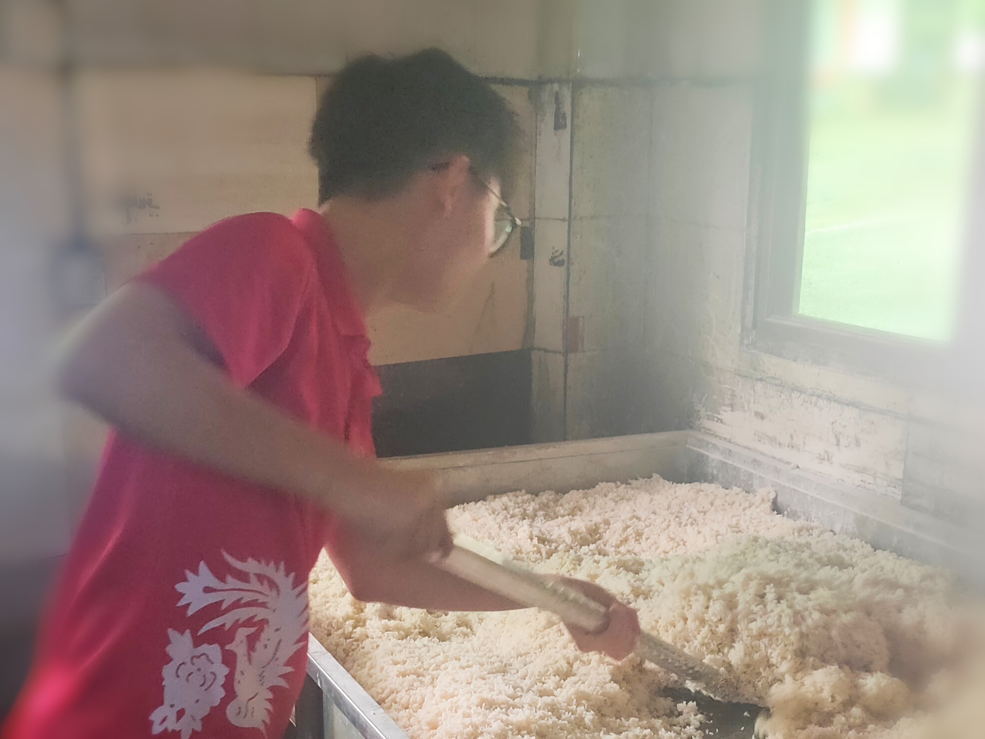 实践团成员体验传统米酒酿造工序(古晓倩 摄)