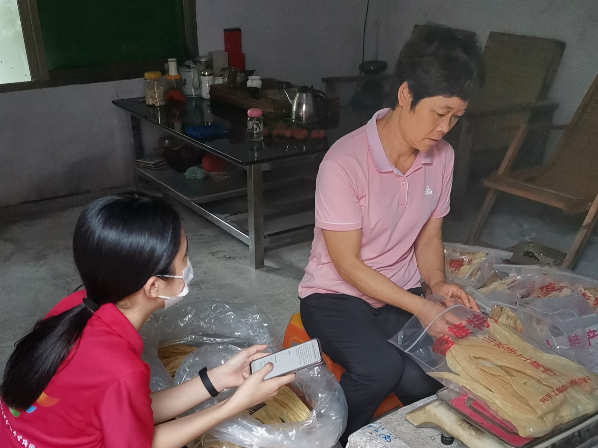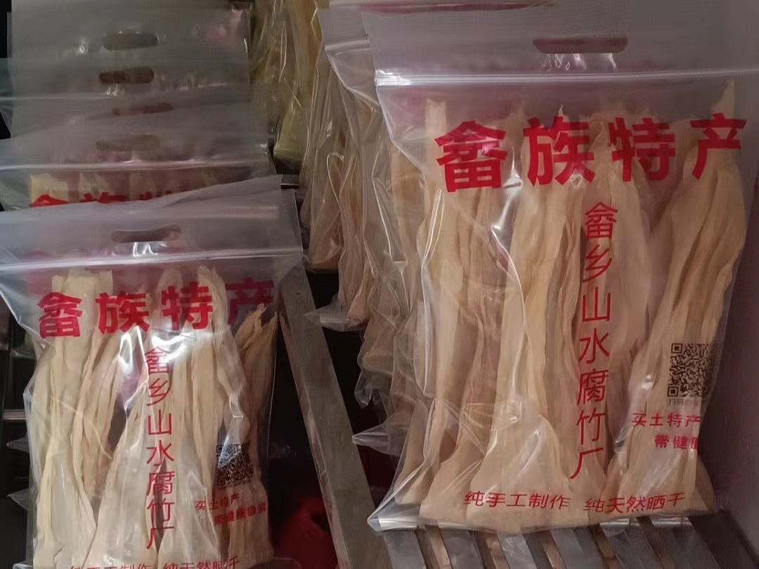 在政府的大力扶持下,畲族村越来越多青年返乡创业,山水腐竹厂更是办得有声有色。在与腐竹厂经营者来姨的交谈中,实践团了解到该腐竹厂是她抓住畲族村大力创建旅游村的机遇,回乡创办的当地唯一一家腐竹厂,其腐竹是经过选豆、浸豆、磨浆、煮浆、捞皮、晾晒六道严谨的纯手工工序制作而成。与市面上大多腐竹采用机器烘干的制作方法不同,其系纯自然晾干而成,因此备受当地居民和游客的喜爱。