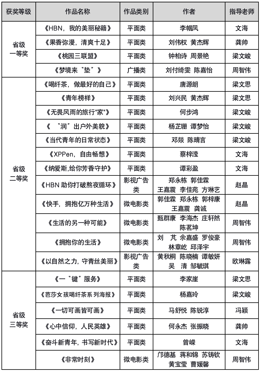 本次大广赛省赛,我校共选送了118件作品参赛。其中,珠宝学院李帼凤同学创作的《HBN,我的美丽秘籍》,刘伟权、黄杰辉同学创作的《果香弥漫,清爽十足》,珠宝学院钟柏诗、周景艳同学创作的《桃园三联盟》均获得平面类广告作品一等奖;管理学院刘付绮雯、陈嘉怡创作的《梦境来“垫”》获得广播类广告作品一等奖。