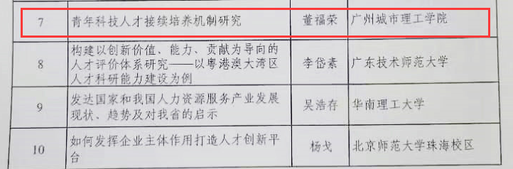 本网讯(记者 应澎)近日,根据广东省哲学社会科学规划领导小组办公室立项通知,我校管理学院董福荣教授及其团队的项目《青年科技人才接续培养机制研究》(项目批准号:GD22TW05-04)获得广东省哲学社会科学规划2022年度“人才研究专项”立项。