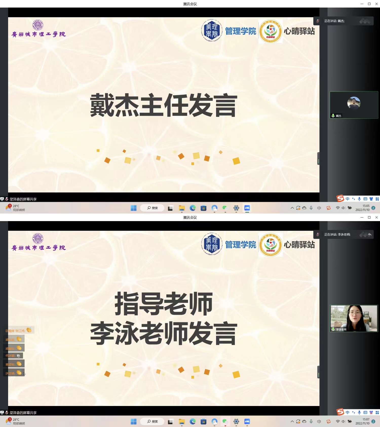 会中,在公布第八届委员名单的同时,还表彰了在过去一年中为心晴驿站工作作出贡献的成员们,在他们的努力下,成功将接力棒传承到第八届小橙子们的手中。随后,新任委员们在李泳老师的带领下进行集体宣誓仪式,委员们将会履行好委员义务,为组织美好未来贡献力量。第八届新任常委连丽英和部长蔡心琪分别提出了自己对新成员的期望,并以自身的经历为新成员提供指导经验。新任干事代表陈致何分享了他在宣传部的收获,不仅交到了很多朋友,学习到了许多推文排版的技能,还让他的校园生活增添了光彩。接下来,他会保持激情,不断强化自己的能力,完善专业技能,完成好部门跟组织交给他的任务。最后,会议通过以线上合照的形式进行合影留念,为本次大会拉下帷幕。