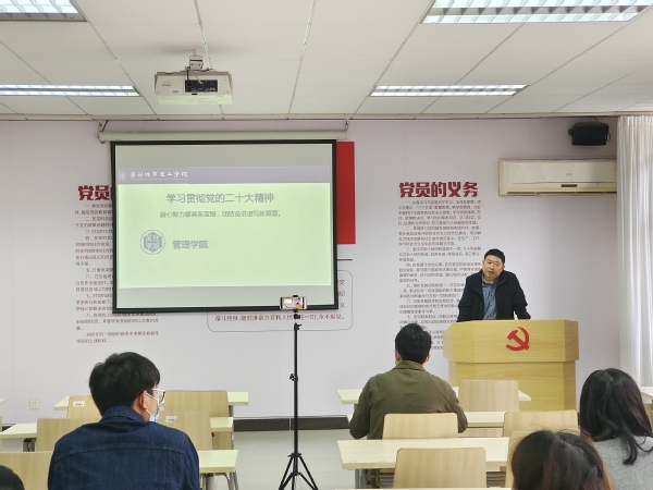 刘志超作为管理学院领导班子带头宣讲党的二十大精神,他结合管理学院人才培养、科研工作、平台建设等分享了学习党的二十大精神的心得和体会。他指出党的二十大报告将“实施科教兴国战略,强化现代化建设人才支撑”单独作为一章进行阐述,是我们党在当下审时度势,根据党的中心任务和我们的发展主题而做出的重大决定。这既是对教育工作者的激励,更是鞭策。因此我们要牢牢认识和把握党的二十大的重大历史意义,切实把党中央重大决策部署转化为推动学院各项工作行稳致远的生动实践。他强调:一要坚定理想信念,时刻保持清醒头脑,深刻体会到每个中国人的责任重大,使命光荣;二要坚持中国共产党的领导,时刻谨记新时代新征程党的使命任务;三要勇于担当作为,时刻保持奋斗的精神,敢于迎接挑战、敢于面对风险,发扬吃苦耐劳的精神;四要坚持创新发展,弘扬创新文化,倡导敢为人先、勇于冒尖的创新精神,使创新贯穿学院各项工作部署;五要大力培养人才,结合创新精神鼓励学生向高水平复合型人才方向不断发展;六要坚定斗争意识,掌握斗争策略,为实现远大目标,坚定不移走下去。