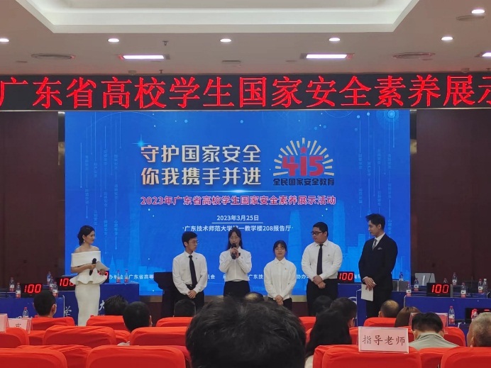 本网讯(记者 孔楚倩)3月25日下午,由广东省高等教育学会保卫学专业委员会主办的以“守护国家安全,你我携手并进” 为主题的广东省高校学生国家安全素养展示活动决赛在广东技术师范大学拉开帷幕,我校代表队沉稳发挥,表现优异,最终获得广东省优胜奖。