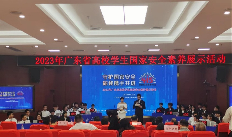 据悉,本次广东省高校学生国家安全素养展示活动旨在充分展示各高校对《中华人民共和国国家安全法》等相关法律法规、大学生安全行为与规范、安全常识及基本知识等学习教育的阶段性成果,进一步激发广大师生对国家安全知识学习的热情。同时安全知识竞赛是全面检验大学生安全教育成效、充分展示大学生精神面貌的一次重要活动,旨在将大学生安全宣传教育活动推向深入。我校代表队在比赛中,面对激烈的赛事环节,沉着冷静、稳定发挥,赛出风采,充分用实际行动展示了我校安全知识学习教育工作的成果。