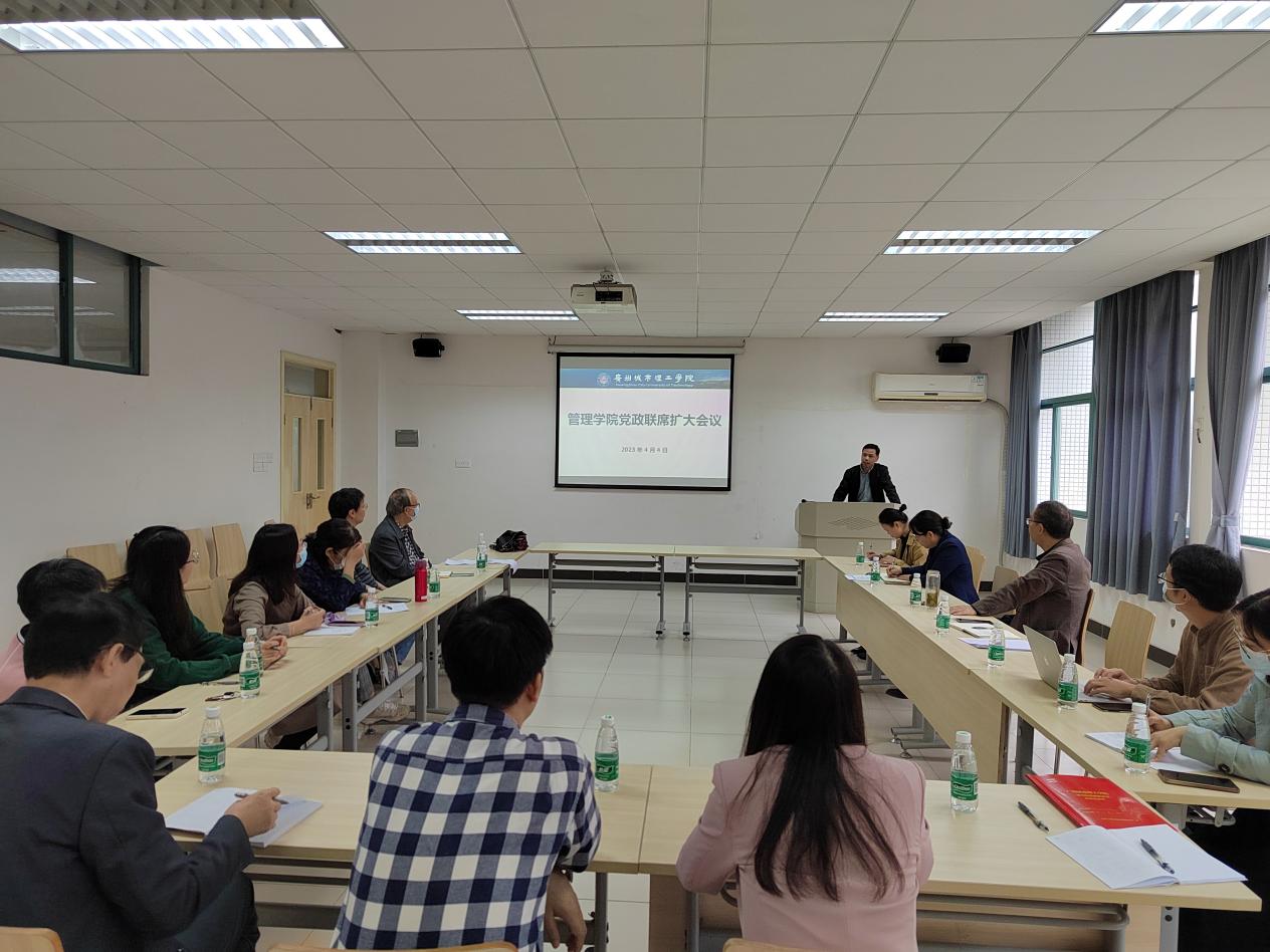 本网讯(记者 戴杰)4月4日上午,管理学院在A8-205召开党政联席扩大会议部署学院安全稳定和毕业生就业创业工作。学院院长朱桂龙、党总支书记李大章、副院长刘飞燕、院长助理徐细珍以及各系、各办公室负责人参加会议。
