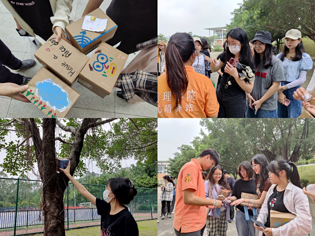 活动开始前,同学们按照指示随机分成多个小组,接着心晴驿站工作人员给队员们讲述了活动流程、规则。在每个人了解完注意事项后,各队伍进行两次抽签,第一次抽到的地点为此队伍的盲盒藏匿地点,第二次抽到的队伍为此队伍需寻找的对应盲盒队伍。