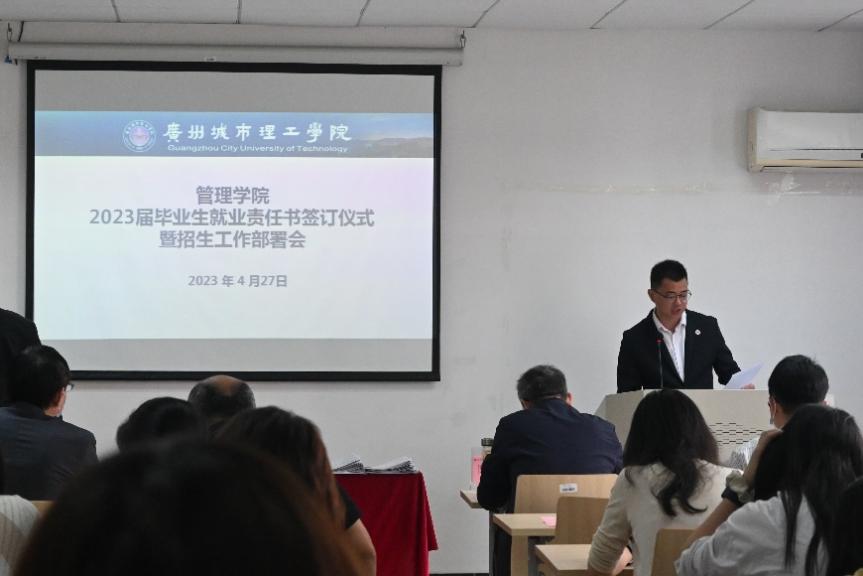 本网讯(记者 张泽宇 黄锶敏)为进一步推进学院2023年毕业生就业创业工作落实和全面启动招生宣传工作,4月27日下午,管理学院在A8-205室举行2023届毕业生就业责任书签订仪式暨招生宣传工作部署会,管理学院院长朱桂龙、学院党总支书记李大章、副院长刘飞燕、院长助理徐细珍以及各系和学生工作办公室负责人、毕业班班主任和全体辅导员参加本次会议。会议由学工办主任戴杰主持。