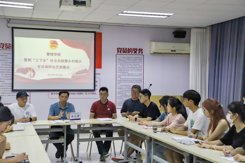本网讯(记者 陈瑶)7月18日晚上,管理学院在A8-203召开暑期“三下乡”社会实践暨乡村振兴专项调研动员部署会。学院党总支书记李大章、学院学工办主任、各实践调研项目团队师生代表参加了本次会议。