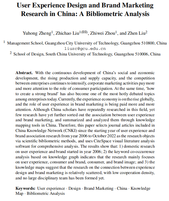 第25届国际人机交互会议(HCII 2023)共有来自85个国家的学术界、研究机构、工业界和政府机构的7472名个人提交了论文,其中1578篇论文和396张海报被收录在会议开始前出版的论文集中。这些论文全面覆盖了人机交互的整个领域,论述了计算机在各种应用领域的知识和有效使用方面的重大进展。会议包括了21个专题领域和附属会议。其中,HCII 2023全球发表的EI论文Design, User experience, Usability论文集一共出版了5本,共188篇论文,我校郑玉红等人发表的论文《User Experience Design and Brand Marketing Research in China: A Bibliometric Analysis》是其中唯一胜出的最佳论文,获得“Best Paper Award”奖项。