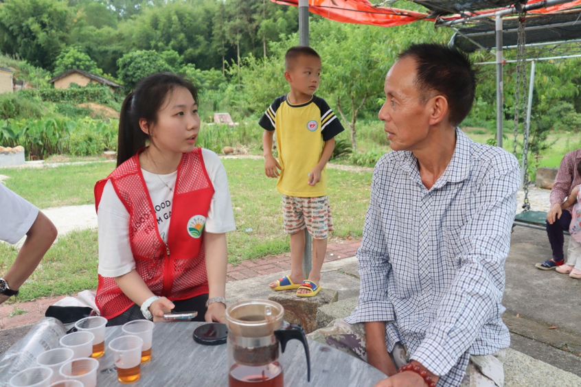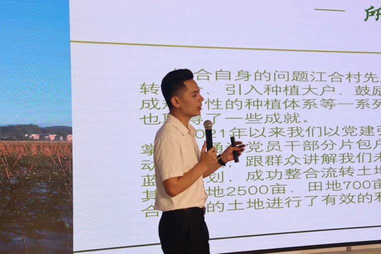 江合村支书欧立成热情欢迎实践团一行的到来并为实践团详细介绍了江合村发展的基本情况和在振兴路上产业发展的优势和内部挑战,展示了江合村近年来所发生的变化。他说到,自2021年以来江合村以“党建引领促乡村振兴”为抓手,开展了土地流转整合、引入种植大户、鼓励党员村民自发形成规模性的种植体系等一系列相对有效的工作,发展了以龙须菜、百香果、沙糖桔等为代表的特色农作物,带动村民的收入;江合村积极鼓励党员、乡贤带头创业,为乡村振兴注入人才“活水”;先后清拆破旧危房、改造旱厕牛舍两百余间,共计面积一万七千多平方,百分之七十的自然村基本完成了新农村建设。通过交流分享,实践团充分认识到,这些措施深刻体现了响应以农民主体、热在乡村、乐在群众的新时代乡村文化生活新要求,有效打通农村居住环境的“最后一公里”。