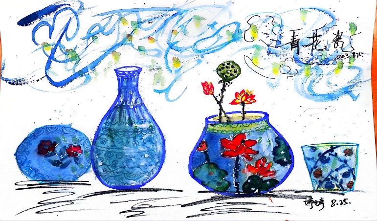 青花瓷水彩画展示现场(刘佳颖 摄)