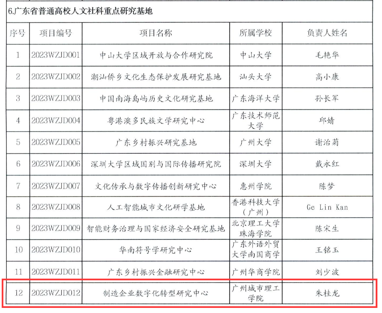 本网讯(记者 归晗)近日,广东省教育厅发布了《广东省教育厅关于公布2023年度普通高校重点科研平台和项目立项名单的通知》(粤教科函【2023】9号),我校管理学院申报的“制造企业数字化转型研究中心”获批为广东省普通高校人文社科重点研究基地。